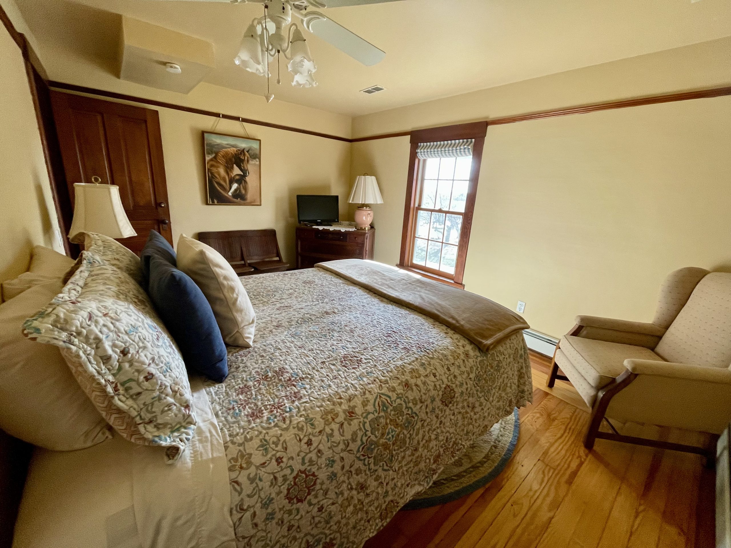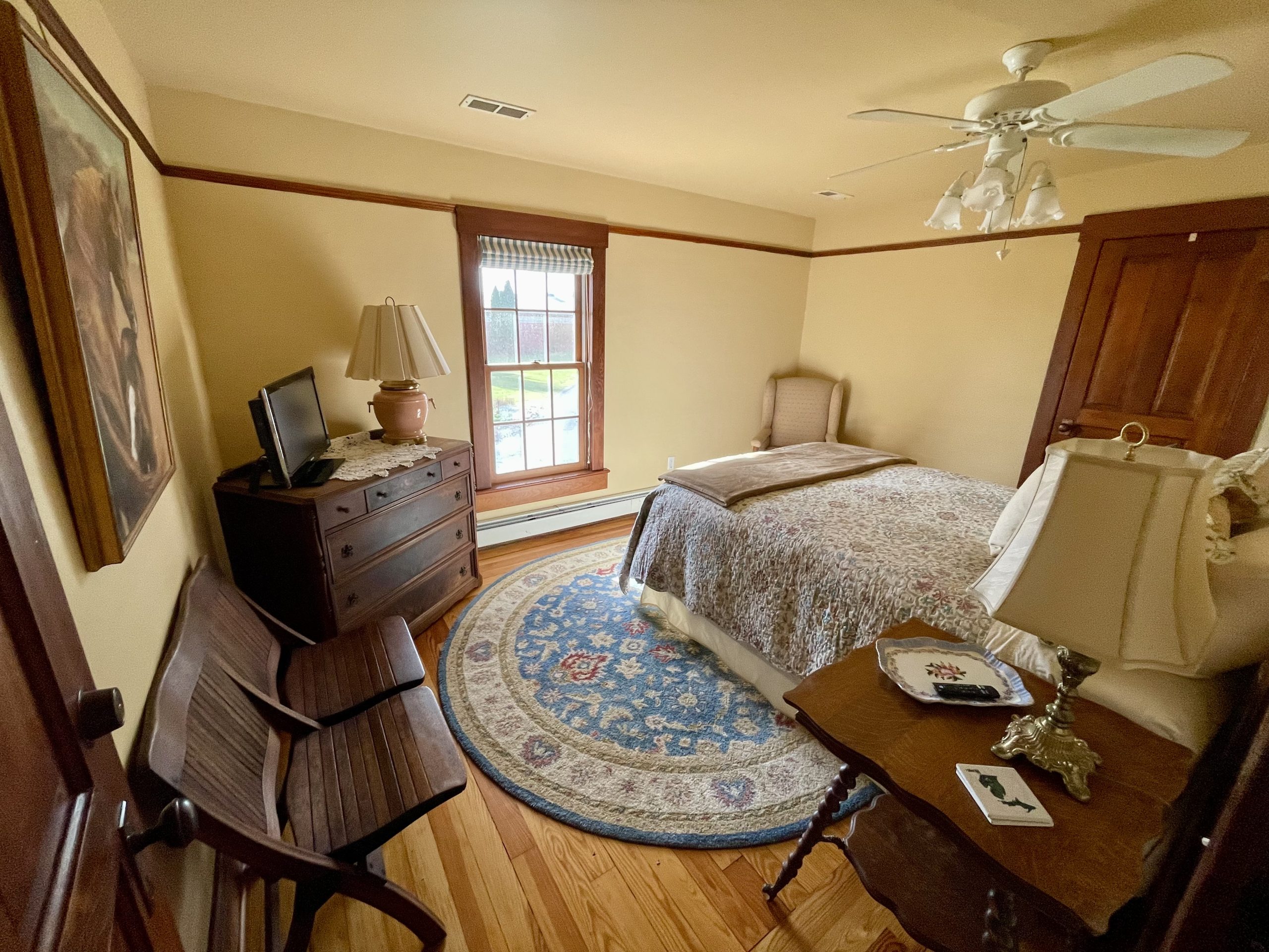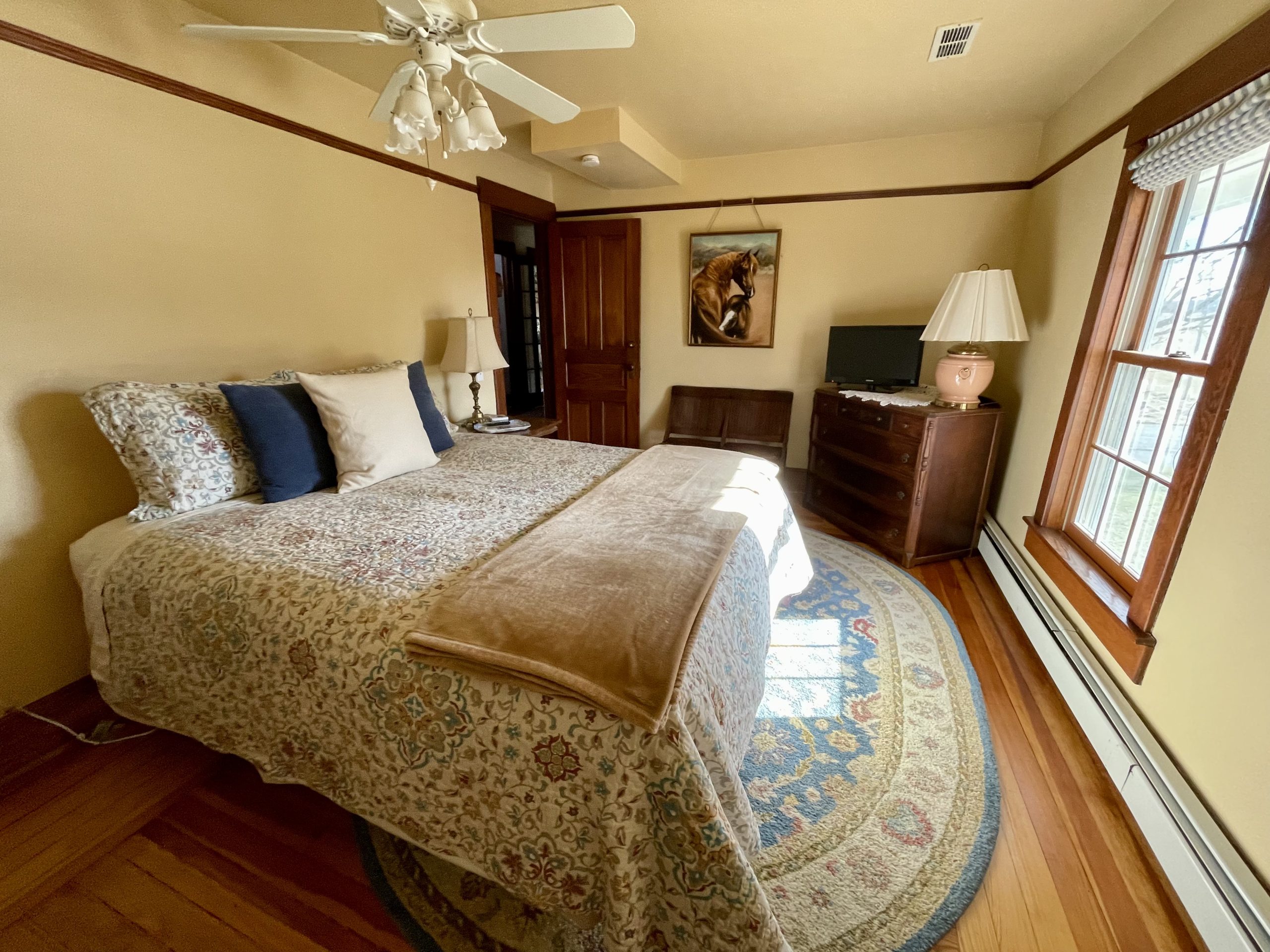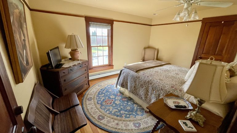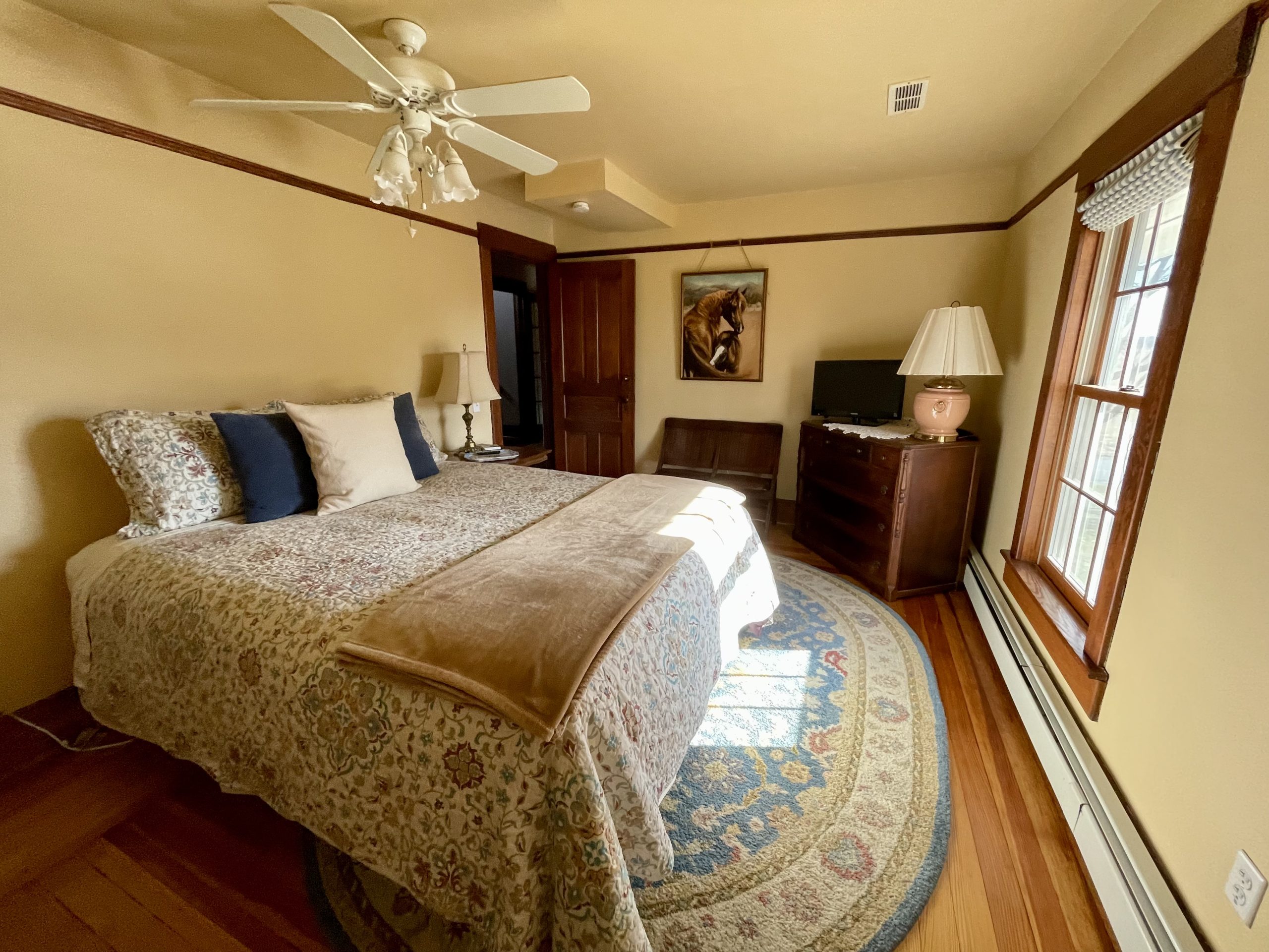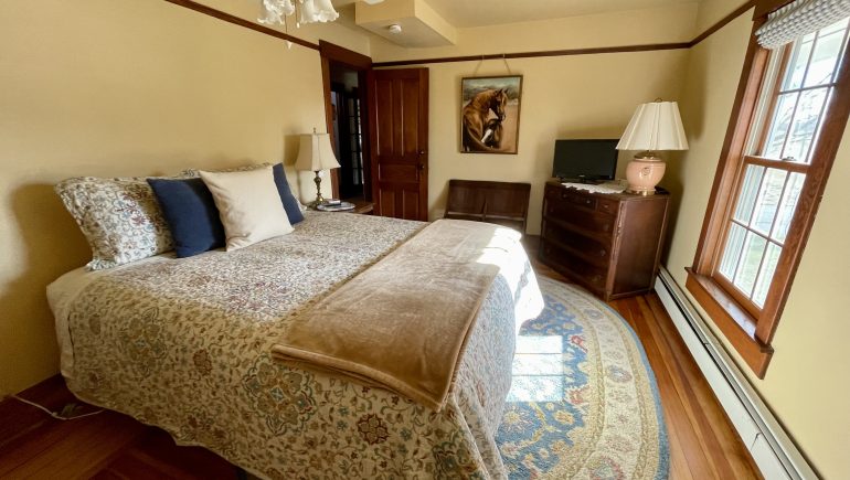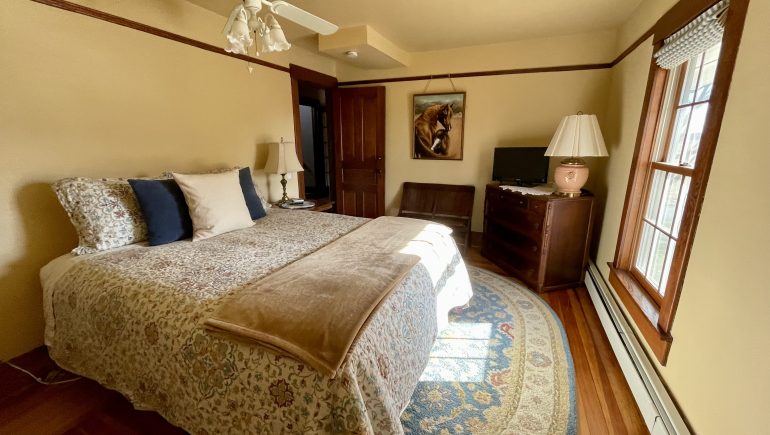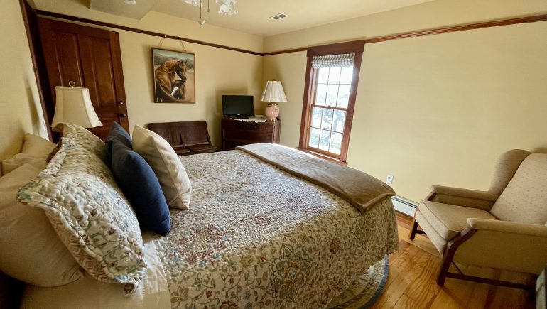 Yellow Room features a queen bed dressed in premium sheets and cozy comforters with a soft alpaca wool blanket for ultimate warmth. A large closet with great space for all that you bring on your travels is part of this lovely musical themed room. Antique musical instruments and art prints cover the walls. Warm bathrobes, towels for the pool and hot tub and extra pillows are in the closet for use during your stay. This room shares the “Birdy Bathroom” with the guests from the Grandma’s Quilts bedroom. Enjoy the wall-mounted DVD player for watching one of the many movies available in the B & B living room. This room faces beautiful farmland, as well as, the B & B backyard.
